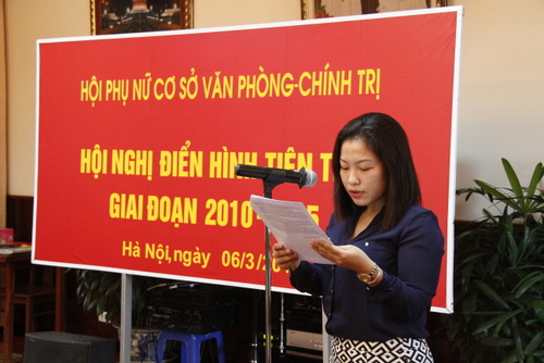 Hội nghị đã được nghe đồng chí Nguyễn Thị Lan Hương, Chủ tịch Hội Phụ nữ cơ sở Văn phòng - Chính trị báo cáo đánh giá biểu dương phong trào thi đua yêu nước của Hội Phụ nữ giai đoạn 2010 - 2015 gắn với đánh giá việc thực hiện Chỉ thị 03 của Bộ Chính trị về “Tiếp tục đẩy mạnh học tập và làm theo tấm gương đạo đức Hồ Chí Minh” và sơ kết 5 năm thực hiện Cuộc vận động “Xây dựng gia đình 5 không, 3 sạch”, chỉ ra những tồn tại, hạn chế cần khắc phục; xác định phương hướng, nhiệm vụ đẩy mạnh phong trào thi đua yêu nước trong Hội Phụ nữ và công tác thi đua, khen thưởng trong những năm tới; đồng thời Hội nghị cũng được nghe Báo cáo tham luận của các điển hình tiên tiến giai đoạn 2010 – 2015.